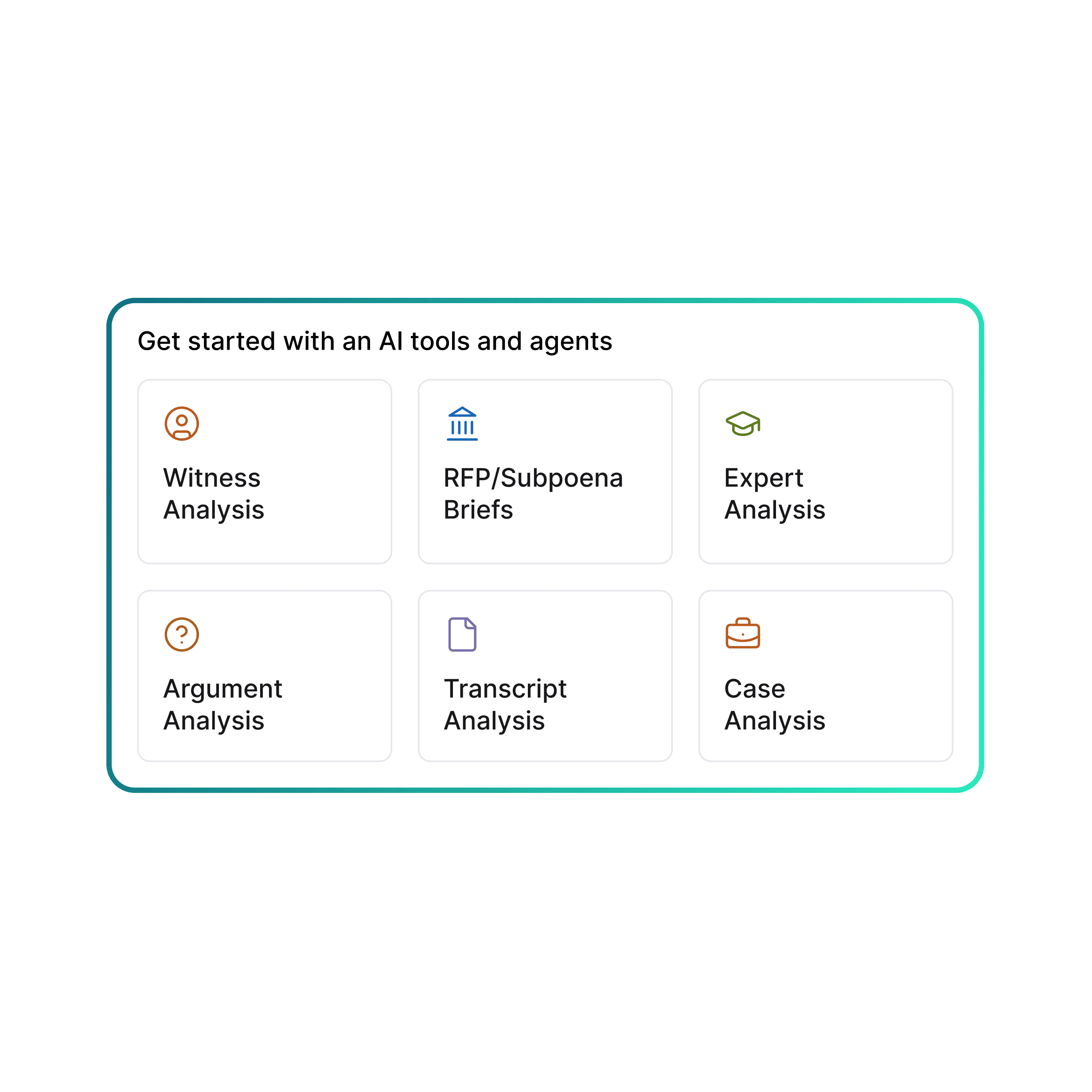 Run agentic workflows with pre-built litigation agents (e.g., transcript review, RFP, contradiction analysis)