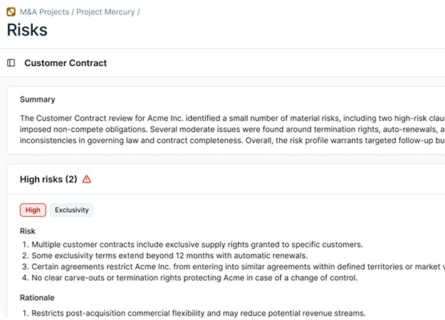 Analyze large volumes of documents quickly, surfacing key risks, patterns, and insights across the deal.